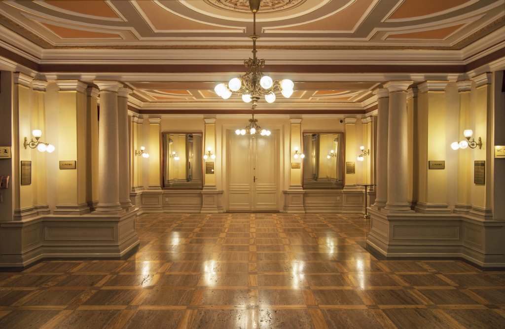 Jakmile vstoupíme do 1. patra, můžeme vidět po obou stranách šatny. Tato část je často využívána jako registrační plocha. Zároveň se zde nacházejí salónky č. 10 a č. 11. Mezaninu (prostor mezi přízemím a 1. patrem) dominuje Socha Pilnosti, dílo Josefa Strachovského.