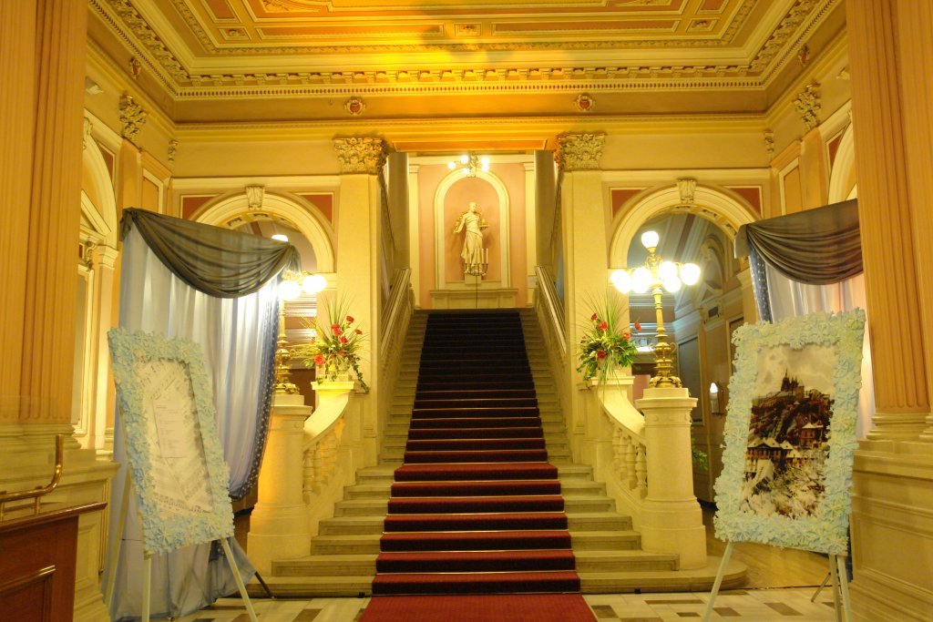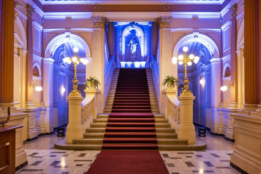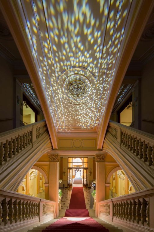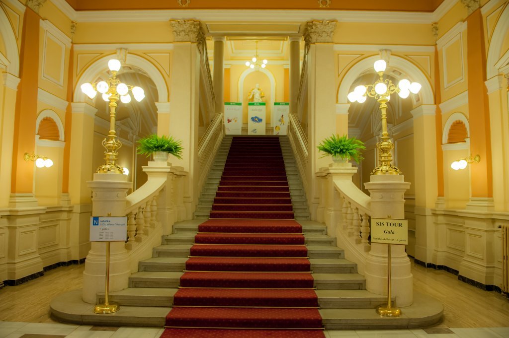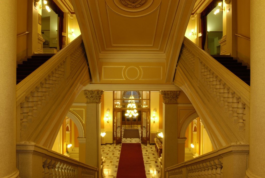 Ve vstupní hale uvidíme majestátní schody, které nás dovedou až do 1. patra. Na mezaninu spatříme Sochu Pilnosti od Josefa Strachovského. Vlevo se se nachází recepce.