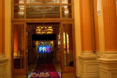 Po vstupu do budovy se nám naskytne pohled na interiér Národního domu na Vinohradech. Po levé straně se nachází pokladna. V levé horní části je na stěně umístěn štítek se základním přehledem informací o budově.